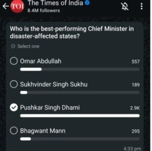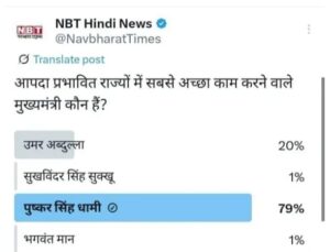 देश के आपदा प्रभावित राज्यों के मुख्यमंत्रियों के प्रदर्शन को लेकर नवभारत टाइम्स ने हाल ही में एक ऑनलाइन सर्वे कराया। सवाल था “आपदा प्रभावित राज्यों में सबसे बेहतर काम करने वाले मुख्यमंत्री कौन हैं?” इस सर्वे में उत्तराखंड के मुख्यमंत्री धामी के अलावा जम्मू कश्मीर के सीएम उमर अब्दुल्ला, हिलाचल प्रदेश के मुख्यमंत्री सुखविंदर सिंह सुक्खू व पंजाब के मुख्यमंत्री भगवंत मान शामिल हैं।