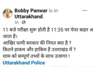 उत्तराखंड अधीनस्थ सेवा चयन आयोग (UKSSSC) की ग्रुप-C परीक्षा का पेपर लीक प्रकरण में हरिद्वार एसओजी ने बेरोजगार संघ के पूर्व प्रदेश अध्यक्ष बॉबी पंवार से पूछताछ की।
