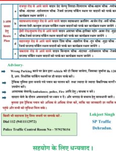 निरीक्षण के दौरान एसएसपी दून द्वारा कार्यक्रम में विशिष्ट तथा अतिविशिष्ट महानुभावो के साथ-साथ भारी संख्या में आम जनमानस के आने की संभावना के दृष्टिगत किए गए सुरक्षा प्रबंधों की समीक्षा की गई। उन्होंने अधिकारियों को निर्देश दिए कि कार्यक्रम में आने वाले महानुभावो व आम जनमानस के वाहनों को पूर्व निर्धारित पार्किंग स्थलों पर ही पार्क कराया जाये, किसी भी दशा में परेड ग्राउंड के आसपास किसी वाहन को आने की अनुमति कदापि न दी जाये।