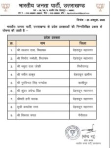 प्रदेश मीडिया प्रभारी मनवीर सिंह चौहान ने कहा कि प्रदेश अध्यक्ष महेंद्र भट्ट के निर्देश पर 9 प्रवक्ताओं की सूची जारी की गयी है।