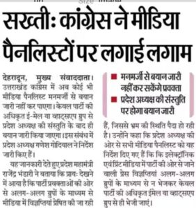 ये सच है कि कांग्रेस में पिछले कुछ सालों से ये चलन हो गया था कि अध्यक्ष से बड़ी खबरें प्रवक्ताओं/पैनलिस्टों की छप रही थीं। पार्टी के कई लोगों का मानना है कि ये अच्छी पहल है। पार्टी को मजबूत करने के लिए सभी सतहों में अनुशासन होना ही चाहिए। प्रवक्ताओं /पैनलिस्टों की तरह कुछ बड़बोले नेताओं के बिगड़े बोल पर भी पाबंदी लगनी चाहिए। हाल ही में कांग्रेस के अलावा भाजपा सरकार में मंत्री रहे डॉक्टर हरक सिंह रावत के एक बयान के बाद उपजे भारी विरोध के कारण पार्टी अध्यक्ष गणेश गोदियाल व पूर्व मुख्यमंत्री हरीश रावत को समुदाय विशेष से माफी मांगनी पड़ी।