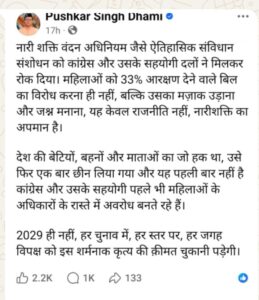 मुख्यमंत्री पुष्कर सिंह धामी ने अपने ट्वीट में कहा है कि विधेयक के विरोध में वोट कर कांग्रेस का महिला आरक्षण विरोधी चेहरा सामने आ गया है।